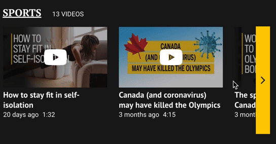 With these in mind I set up to make mid to hi-fi prototypes, first I played around with how to display more videos (from shadowing to scroll buttons). And as a team we ended up deciding on a horizontal full length scroll function and an auto scroll button. Another notable pivot was that we ended up forgoing the shadow approach as it is not accessible and might potentially cause some difficulties for our users with vision impairment.